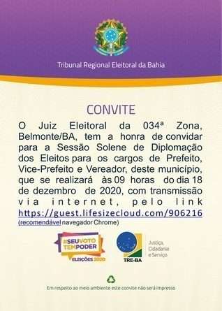 Read MoreJuiz Eleitoral da 034ª Zona, Belmonte/BA, tem a honra de convidar para a Sessão Solene de Diplomação dos Eleitos